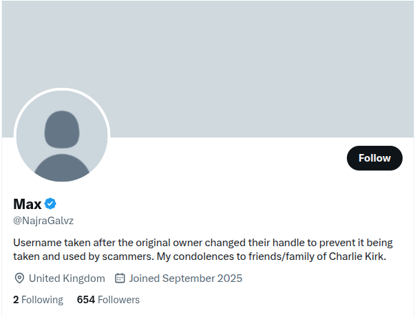 Username taken after the original owner changed their handle to prevent it being taken and used by scammers. My condolences to friends/family of Charlie Kirk.
