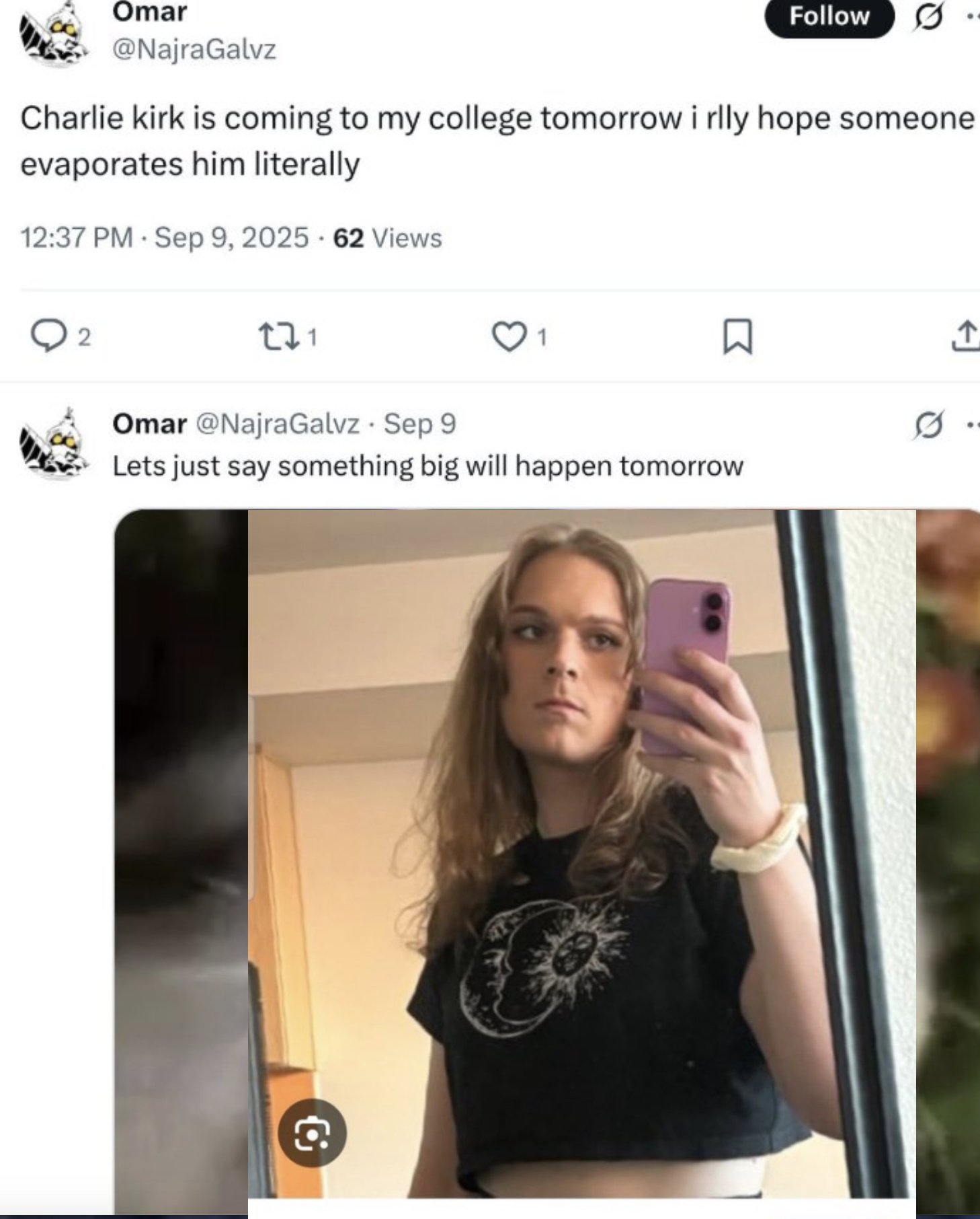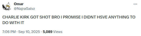The photograph is from the account @MKaylaUltra. That account had no public posts about Charlie Kirk. @NajraGalvz had retweeted one post from @MKaylaUltra unrelated to the shooting or Charlie Kirk.