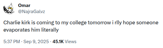 Charlie kirk is coming to my college tomorrow i rlly hope someone evaporates him literally